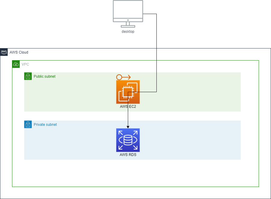 위의 그림은 AWS EC2를 Bastion Server로 활용하여 외부에서 AWS VPC의 Private Subnet에 존재하는 AWS RDS에 접근하는 것을 간단하게 그린것이다.