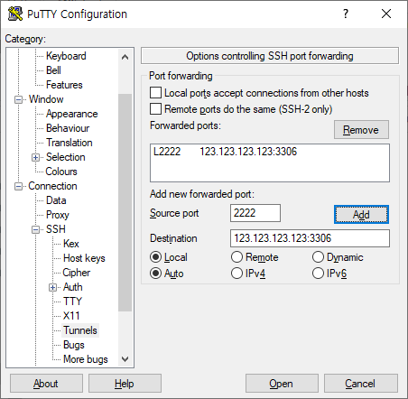 '내 PC의 2222 포트로 접속하면 123.123.123.123:3306로 연결 됨'