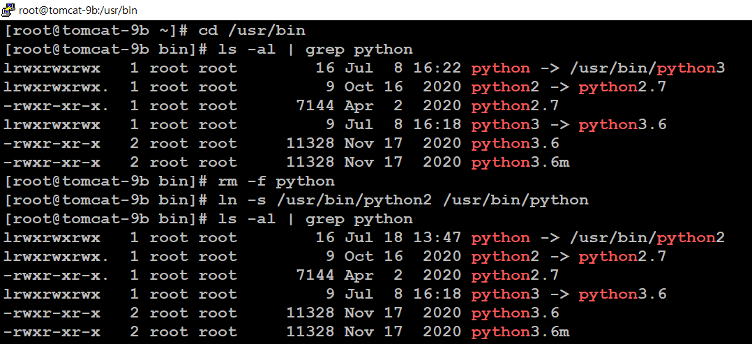 2. 기존 python3로 생성되어있던 심볼릭 링크를 제거하고 python2로 심볼릭 링크 생성